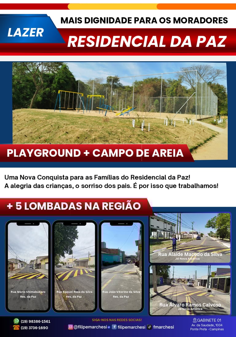 Também foram entregues o Playground + Campo de Areia no Residencial da Paz e 5 Lombadas em toda a região.
